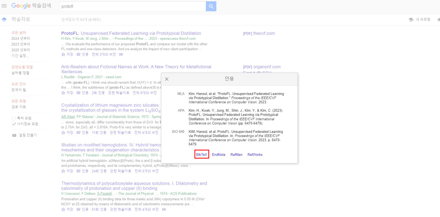 인용버튼을 누르면 다양한 형식의 인용문구가 나오는데, 단순 게시글을 작성한다면 그대로 사용하면 되고, overleaf 등의 도구를 이용한다면 아래 BibTeX 문법으로도 인용문구를 저장할 수 있다.