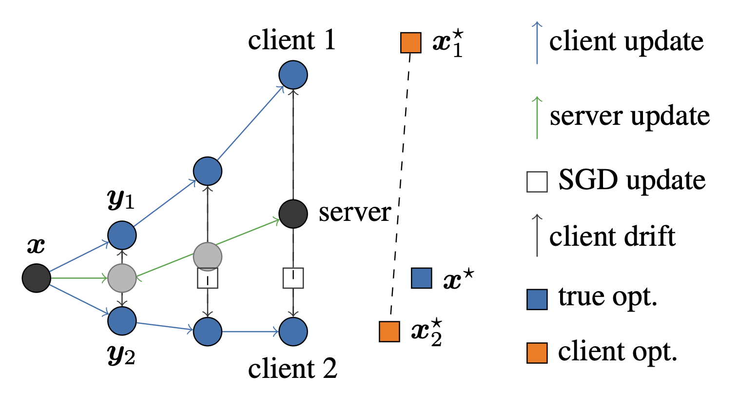 $y_i$는 i번째 클라이언트의 local model, $g_i$는 i번째 클라이언트의 기울기, $c, c_i$는 각각 global model의 correction term, i번째 클라이언트의 local model correction term.