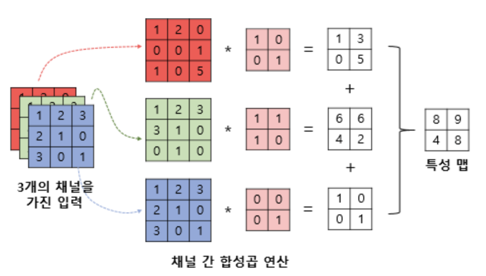 Convolution 연산은 위 그림과 같이 입력과 각 Convolution 커널과의 곱연산, 그 이후 합연산을 통해 특징을 생성한다. 여기서 3차원 등 다차원일 경우에는 연산한 특징을 다시 한번 합연산을 수행하여 최종 특징을 생성한다.