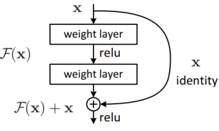 기존의 문제점은 네트워크의 깊이가 깊어질수록 underfitting 문제가 발생했다. Residual Block은 그림과 같이 이전 레이어의 입력 x를 현재 레이어의 출력 F(x)에 더해주는 모듈이다. 이 개념 덕분에 층이 깊어져도 입력 정보를 유지할 수 있어서 최소한 기존 네트워크보다 성능이 떨어지지 않는 구조가 된다.